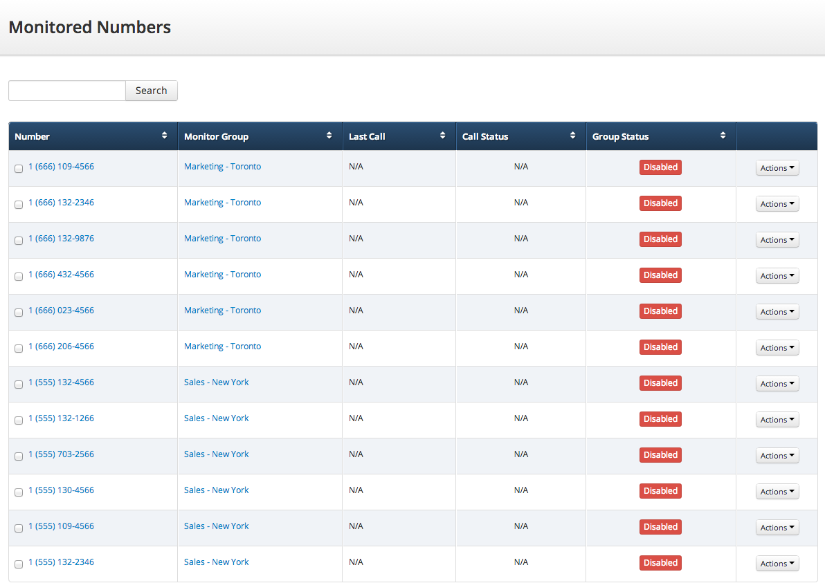 Each number has an action button which allows you to perform the same actions that you can from the Groups page (refer to Section 4 – Groups). And just like the Groups page you can apply these actions to one number or to multiple numbers by checking the box beside any numbers you choose and then clicking the “Bulk Actions” button.
